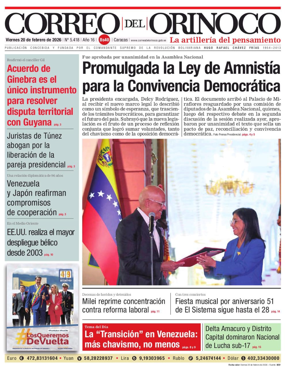 Edición Impresa Correo del Orinoco N° 5.418 Viernes 20 de febrero de 2026