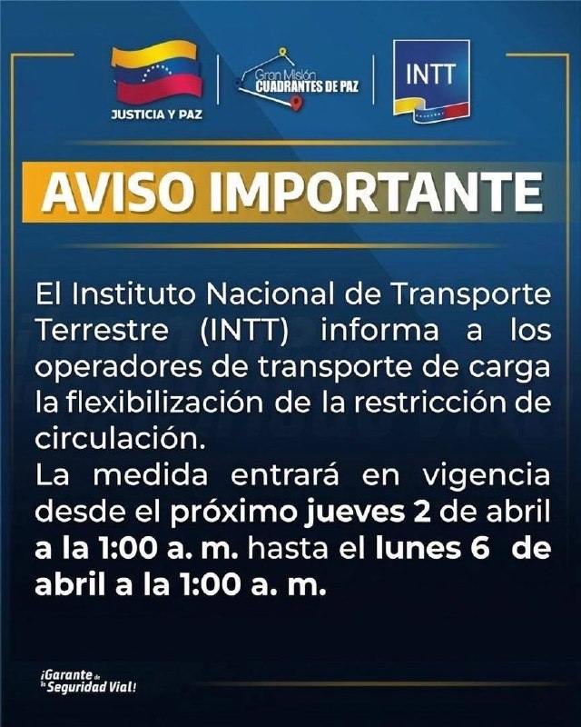 INTT flexibiliza circulación de carga pesada durante Semana Santa 2026