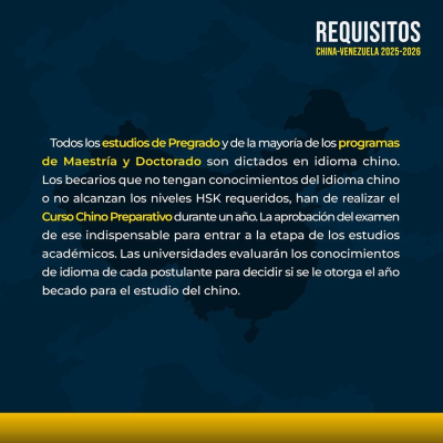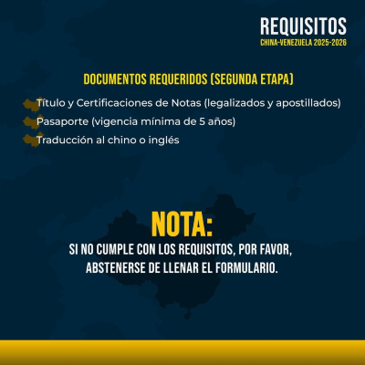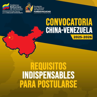 El Ministerio del Poder Popular para la Educación Universitaria anunció el inicio del proceso de postulaciones para el Plan de Becas de Gobierno entre la República Bolivariana de Venezuela y la República Popular China, a través de Fundayacucho, que permitirá realizar estudios especializados en el gigante asiático con una beca del Gobierno Bolivariano y cuyas inscripciones se llevarán a cabo desde el 5 de noviembre de 2024 hasta el 22 de febrero del 2025.