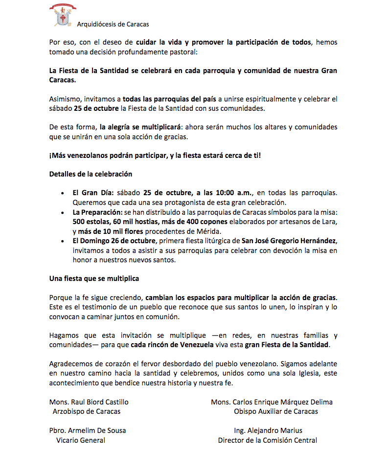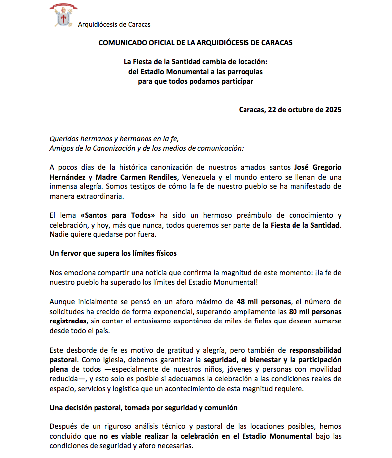 La Arquidiócesis de Caracas informó este miércoles, mediante un comunicado, que la celebración por la canonización de los dos primeros santos venezolanos José Gregorio Hernández y Madre Carmen Rendiles no se realizará en el Estadio Monumental este sábado, como se había previsto inicialmente, debido a limitaciones de seguridad y capacidad.