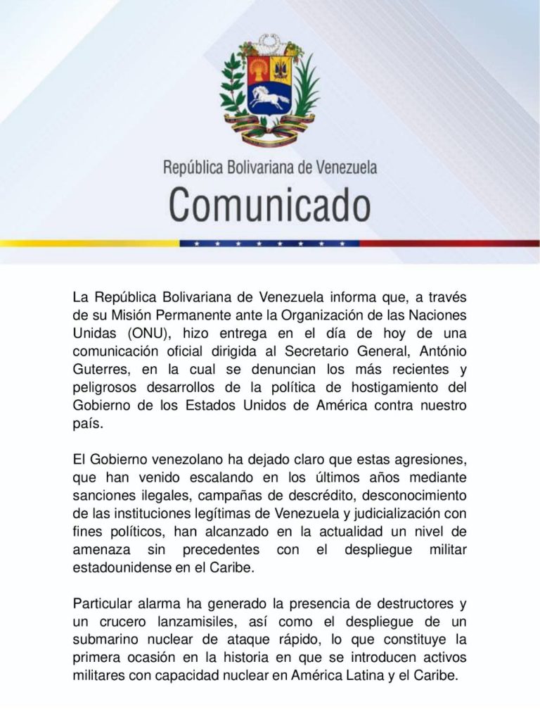 A través de su Misión Permanente ante la Organización de las Naciones Unidas (ONU), el Gobierno de la República Bolivariana de Venezuela entregó una comunicación oficial dirigida al secretario general del referido organismo, António Guterres, en la cual denuncia la más reciente y peligrosa aplicación de la política de hostigamiento de los Estados Unidos (EE.UU.) en contra del país.