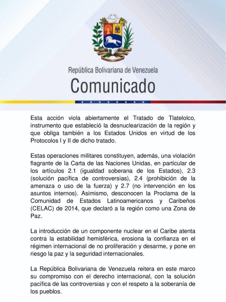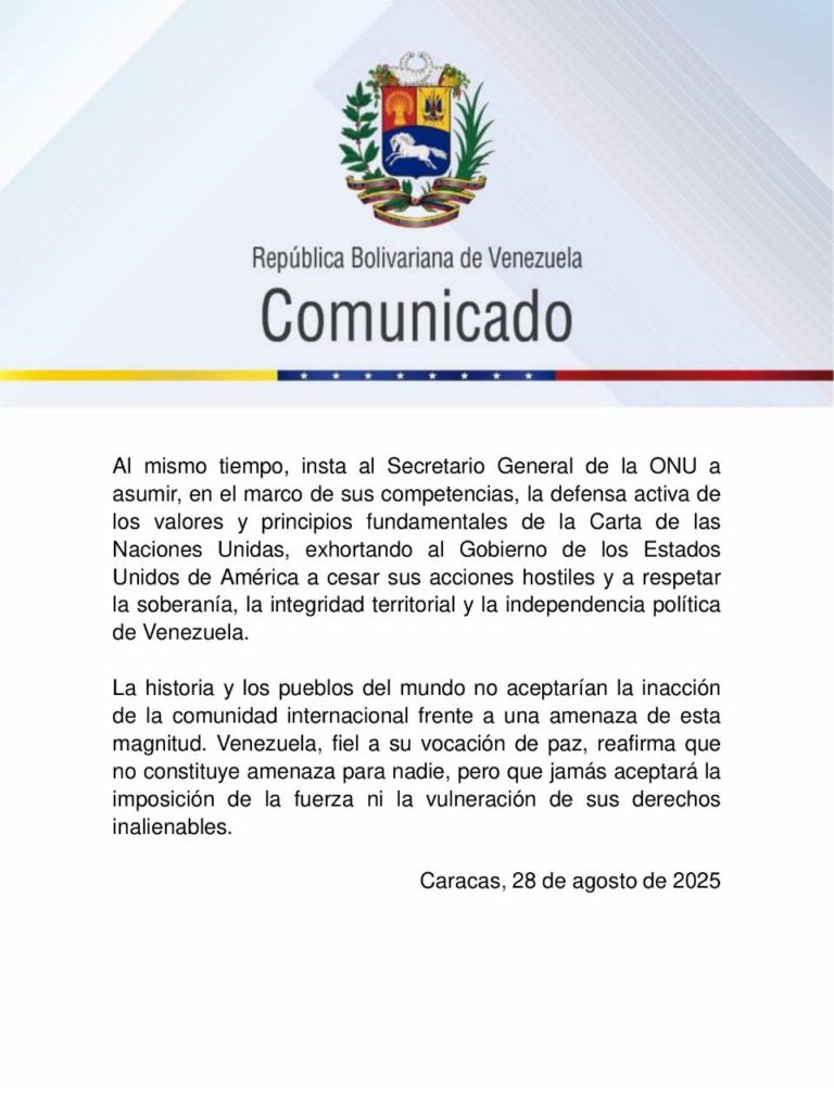 De igual manera, el documento emitido por el Gobierno nacional insta al secretario general de la ONU a asumir, como parte de sus competencias, la defensa de los valores y principios fundamentales de la Carta de las Naciones Unidas, al exhortar a la administración de los Estados Unidos a respetar la soberanía, la integridad territorial y la independencia política de Venezuela.