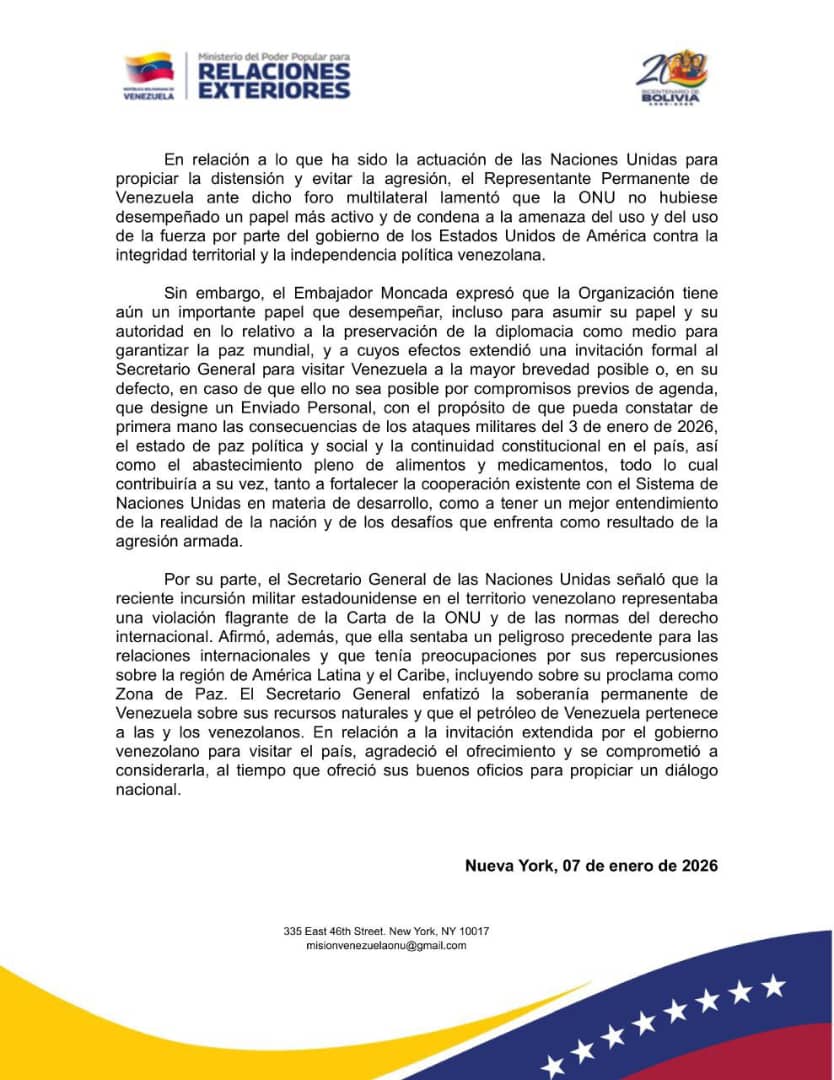 Mientras tanto, Guterres señaló que la reciente incursión militar estadounidense en el territorio venezolano representaba una «violación flagrante de la Carta de la ONU y de las normas del derecho internacional» Afirmó, además, que ella sentaba un «peligroso precedente para las relaciones internacionales».