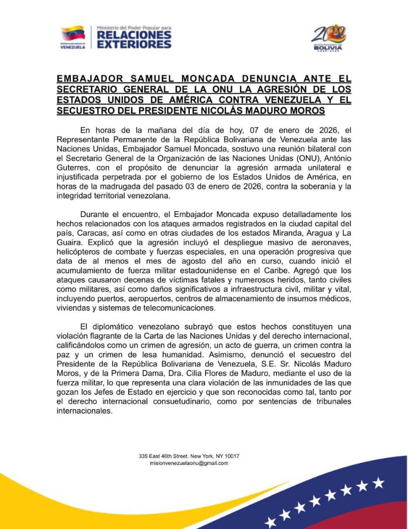 El representante permanente de Venezuela ante la Organización de las Naciones Unidas (ONU), embajador Samuel Moncada, denunció este miércoles la agresión armada unilateral e injustificada perpetrada por el gobierno de los Estados Unidos, el pasado 3 de enero de 2026, contra la soberanía y la integridad territorial venezolana.