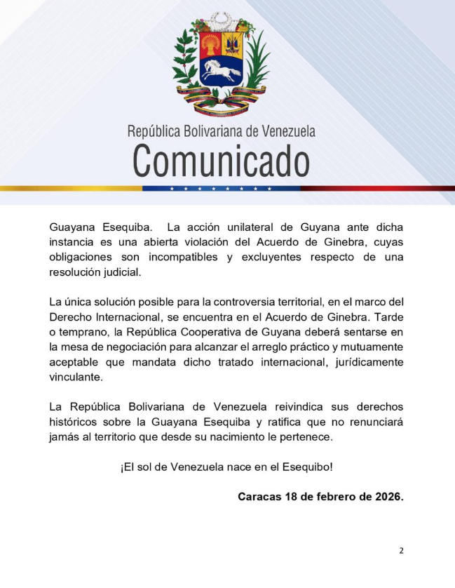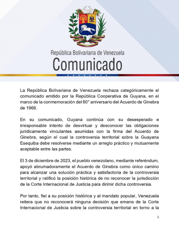La República Bolivariana de Venezuela emitió un pronunciamiento oficial en el que rechaza categóricamente el comunicado emitido por la República Cooperativa de Guyana, a propósito de la conmemoración del 60.° aniversario del Acuerdo de Ginebra de 1966.
