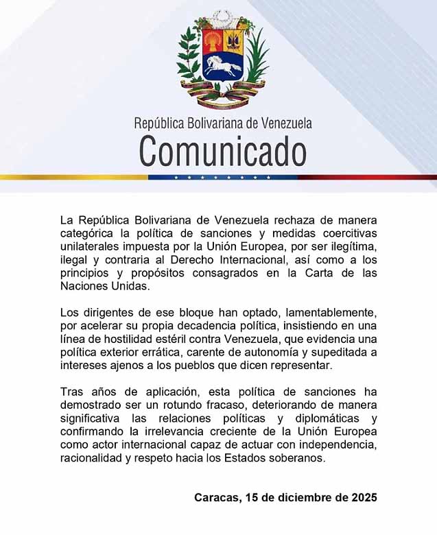 Asimismo, el Gobierno venezolano señaló que estas acciones responden a intereses ajenos a los pueblos europeos y reiteró su rechazo a cualquier medida coercitiva unilateral dirigida contra el país.